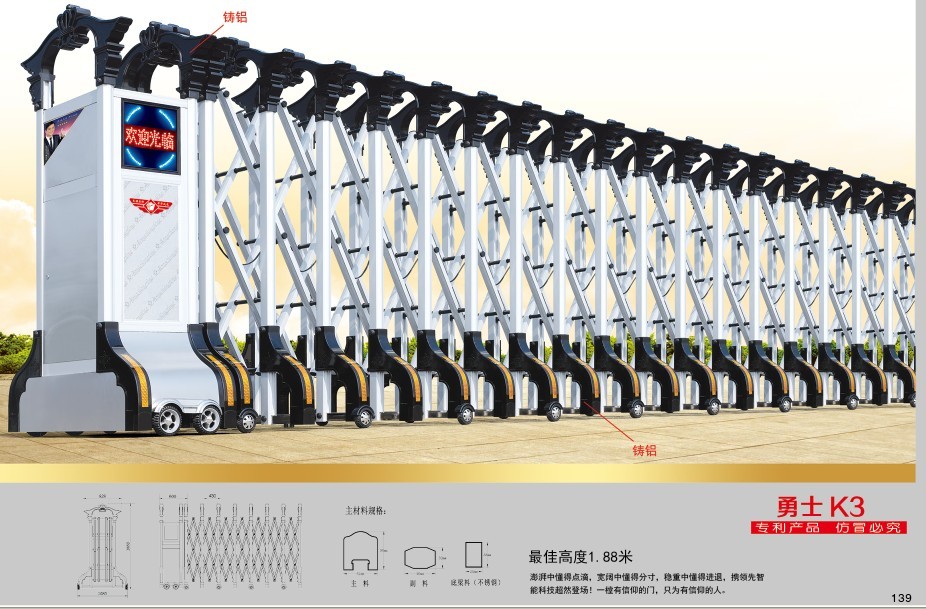 三、电动门的门排门轮采用高强度耐磨航空橡胶轮,轮与轮之间安装滚动轴承,产品的较大宽度830至900毫米,控制电压不超过24V,能确保使用者安全。